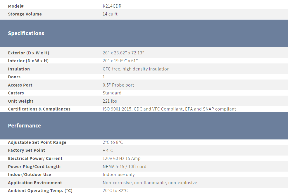 K2 Scientific's 14 cubic foot glass door refrigerator is designed to meet the stringent vaccine storage requirements. These refrigerators are a trusted choice for medical facilities, research laboratories, and pharmaceutical companies. With a small footprint design, they are perfectly suited for spaces with limited room, where every square inch is valuable.
