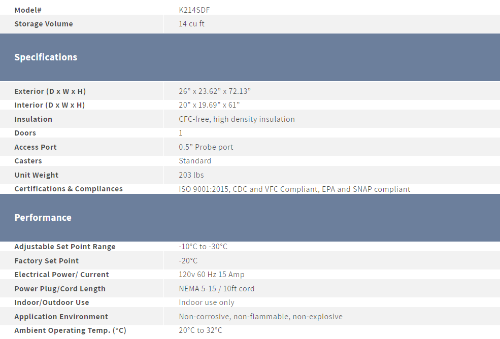 K2 Scientific's 14 cubic foot solid door freezer is designed to meet the stringent vaccine storage requirements. These refrigerators are a trusted choice for medical facilities, research laboratories, and pharmaceutical companies. With a small footprint design, they are perfectly suited for spaces with limited room, where every square inch is valuable.