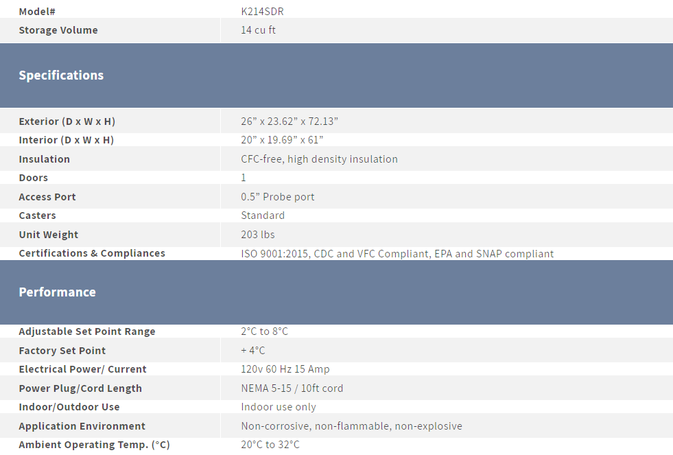 K2 Scientific's 14 cubic foot solid door refrigerator is designed to meet the stringent vaccine storage requirements. These refrigerators are a trusted choice for medical facilities, research laboratories, and pharmaceutical companies. With a small footprint design, they are perfectly suited for spaces with limited room, where every square inch is valuable.