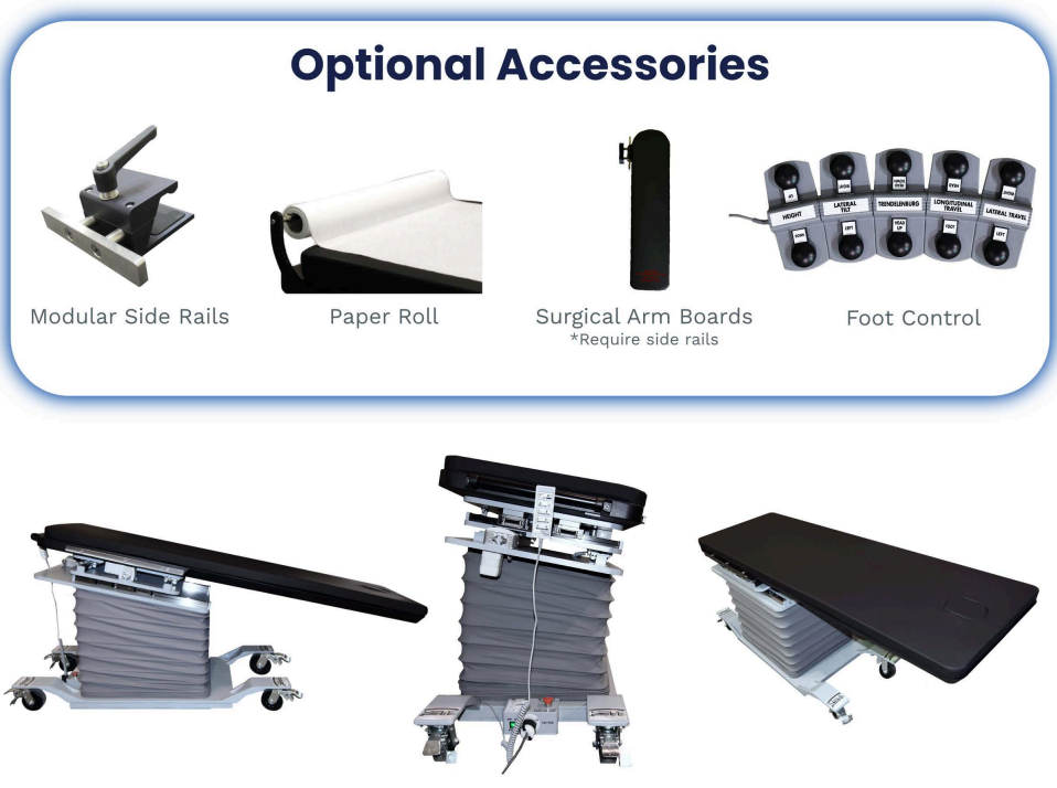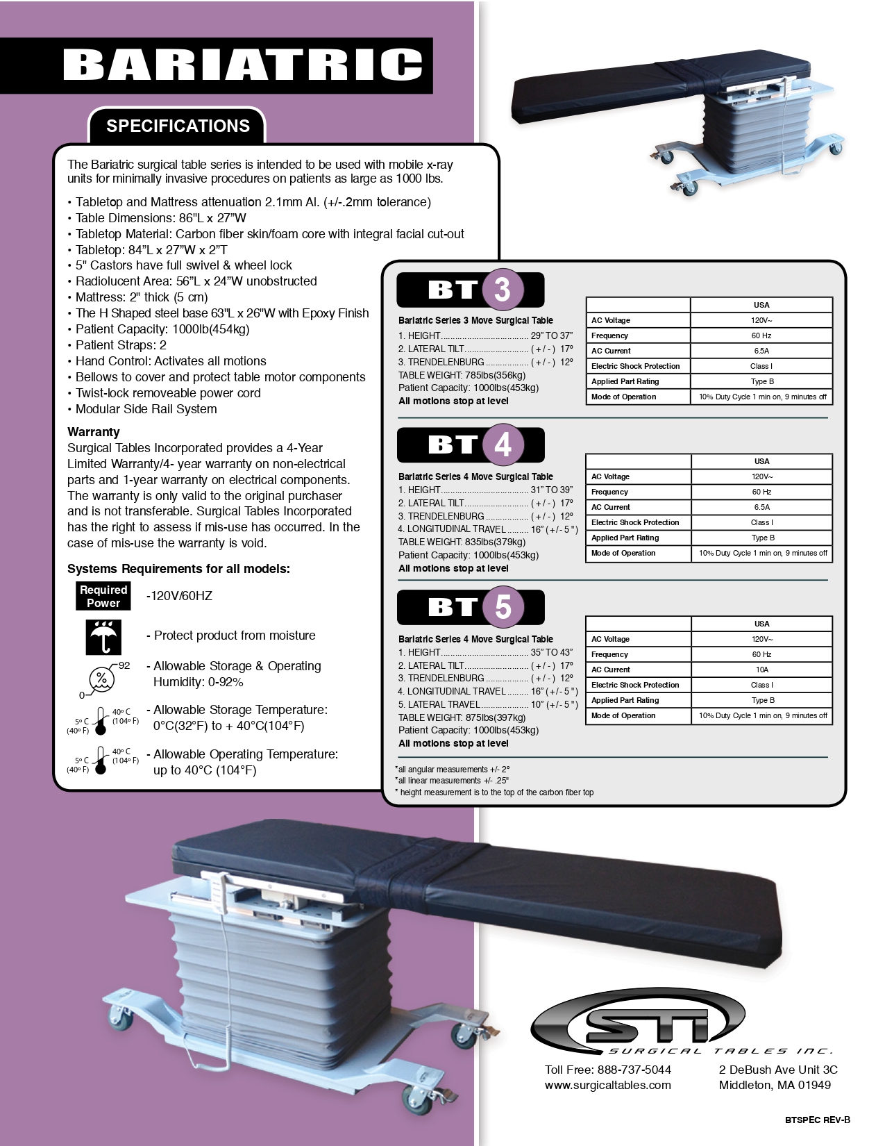 - BT-3 offers Height (29″ to 37″) and also Lateral Tilt (+/- 17° ), and Trendelenburg (+/- 12°) adjustments.