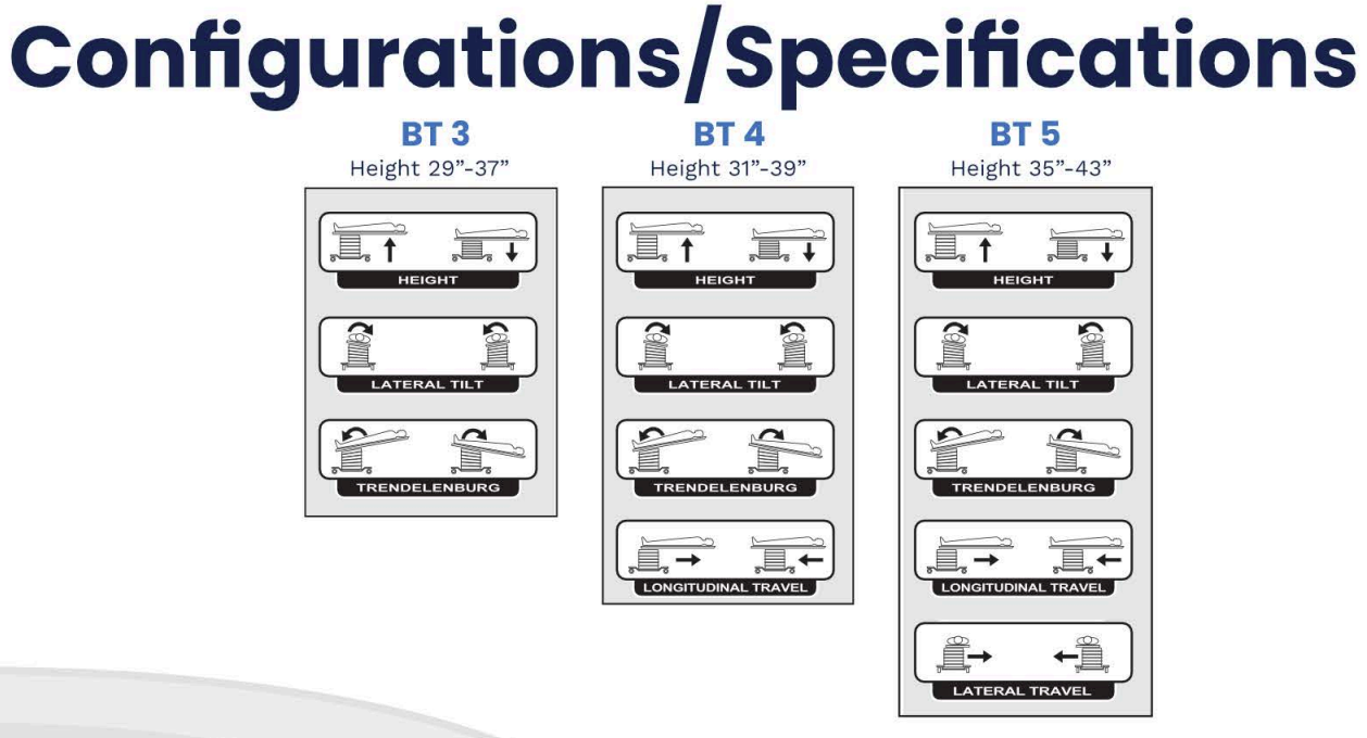 - BT-5 offers Height (35″ to 43″) and also Lateral Tilt (+/- 17°), Trendelenburg (+/- 12°), longitudinal travel (16″, +/- 8″), and lateral travel (10″, +/- 5″) adjustments.