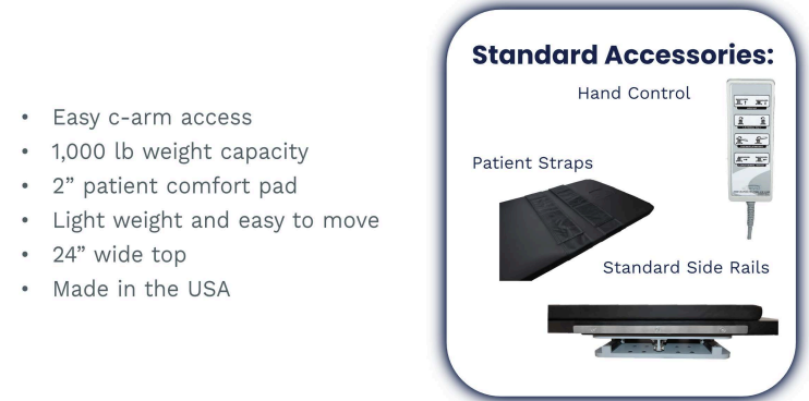 The BT series bariatric imaging c-arm tables can be used for a multitude of procedures including not only pain management/spine, but GI, bariatric surgery, and more. You will love not only the quality of our tables, but the excellent service we provide. We make our c-arm tables in our factory in Massachusetts.