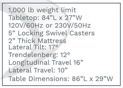 - BT-4 offers Height (31″ to 39″) and also Lateral Tilt (+/- 17°), Trendelenburg (+/- 12°), and longitudinal travel (16″, +/- 8″) adjustments.