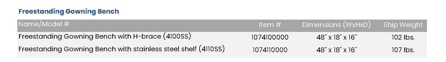 Our freestanding gowning bench is a heavy-duty stainless steel bench that provides a comfortable and practical seat for applying personal protective equipment such as shoe covers and gloves. The solid top allows for sterilization and floor mounting options for secure placement. Rounded edges for seating comfort and ensuring resistance to thin fabric snagging. Available with H-brace or stainless steel shelf under the bench seat.