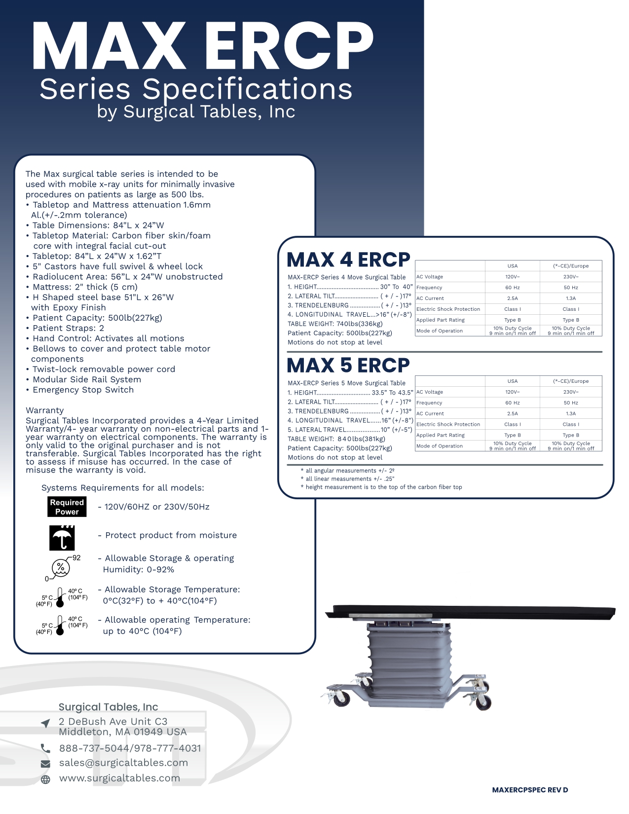 - MAX 4 – Height (30″ to 40″), and also Lateral Tilt (+/- 17°), Trendelenburg (+/- 13°), and longitudinal travel (10″, +/- 5″) adjustments.
