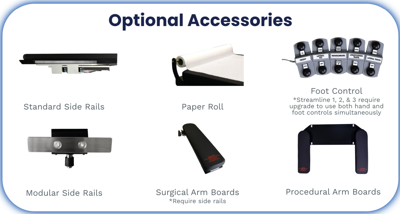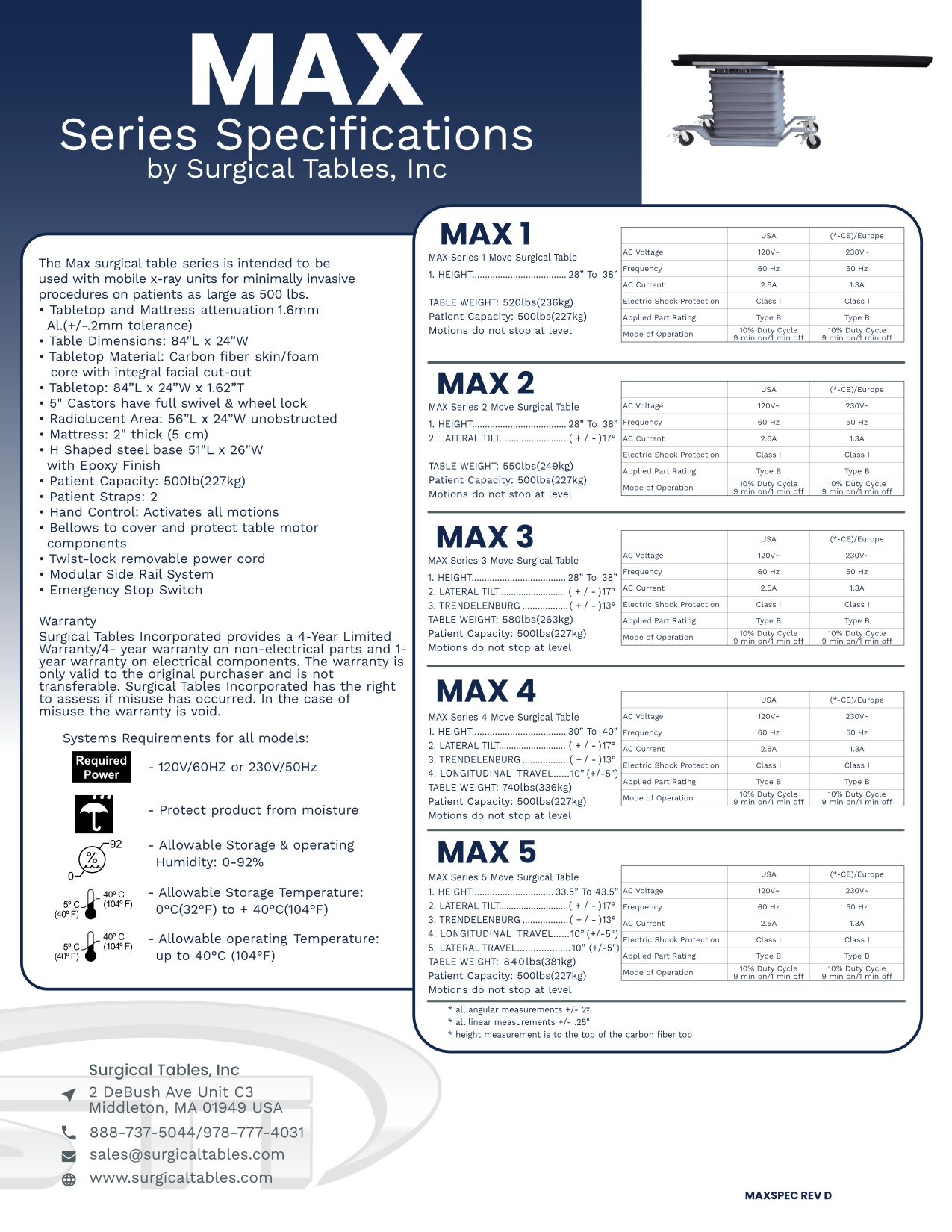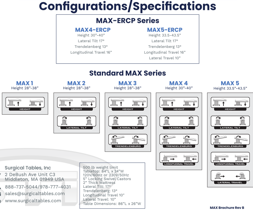 - MAX-3 – Height (28″ to 38″), and also Lateral Tilt (+/- 17° ), and Trendelenburg (+/- 13°) adjustments.