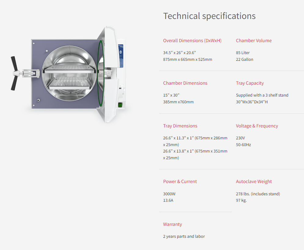 Rapid cycles optimize the availability of ready-to-use sterile instruments. 3 Pre-set sterilization programs. Standard unwrapped cycle Hot start: 23 min, Cold Start 32 min. Cycle times are approximate and may vary depending on instrument loads. Program and customize cycle parameters to suit your needs and maximize flexibility.