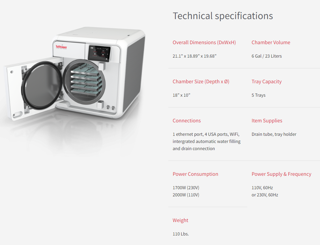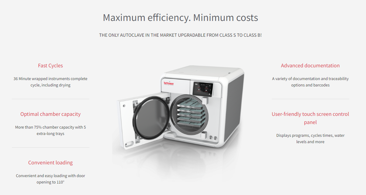 Tuttnauer Tuttnauer T-EDGE 11 Automatic Autoclave Log in for pricing 11" Chamber Size T-EDGE 11 AUTOCLAVE The only gravity and airflow removal autoclave upgradable to pr…