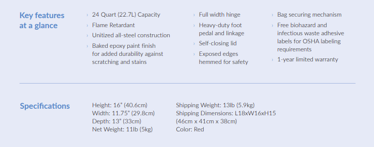 The UMF Medical 1473R Waste Receptacle is made of heavy-duty steel and features a foot pedal operated lid. It also includes a bag securing mechanism for quick and and easy clean up as well as free bio-hazard and infectious waste adhesive labels for OSHA labeling requirements. Comes with a 1-year limited warranty.