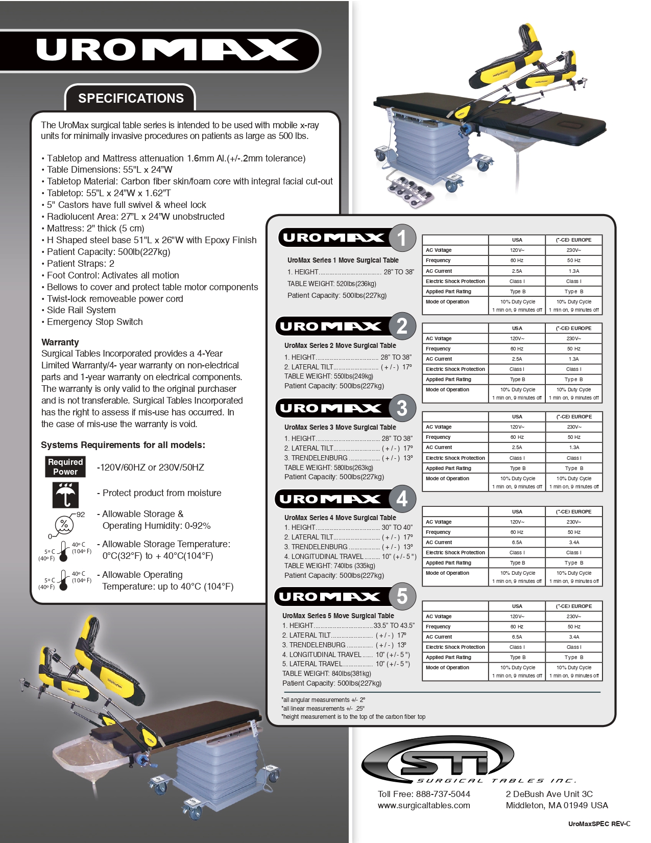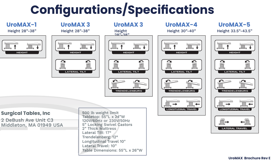 - UROMAX-4: Height (30″ to 40″) ,and also Lateral Tilt (+/- 17°), Trendelenburg (+/- 13°), and longitudinal travel (10″, +/- 5″) adjustments.