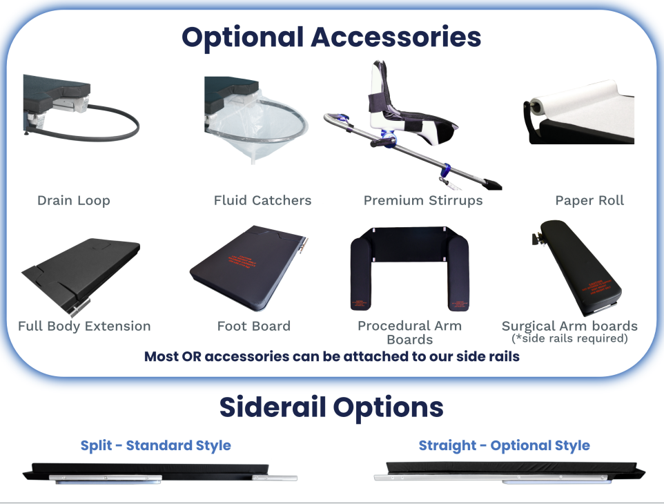 - Choose your side rails: We offer a “split” side rail option which many choose when performing lithotomy procedures. You can also choose side rails which run the length of the table