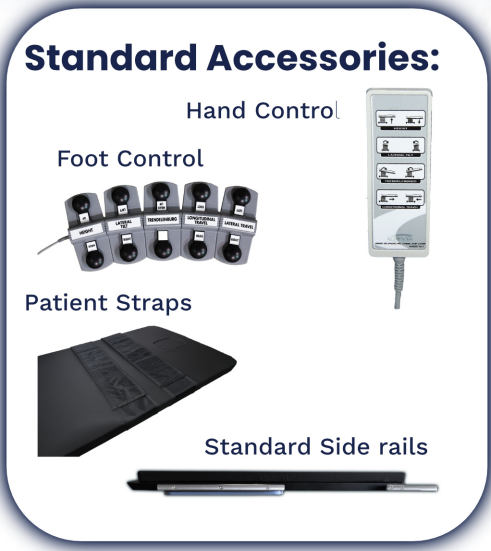 All URO-MAX series imaging tables include a remote control, patient straps, fixed side rails, and a foot control.