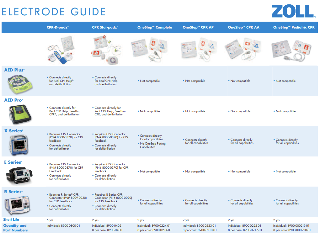 The CPR-D-padz are designed for Zoll AEDs. They are a one piece defibrillation and CPR system with compression, as well as Real CPR Help depth, See-Thru CPR, and rate sensors. These pads also feature a unique design with CPR landmark for hand placement making it easy to place on the victim, and have the longest shelf life of any defibrillator electrode sold today (5 years).